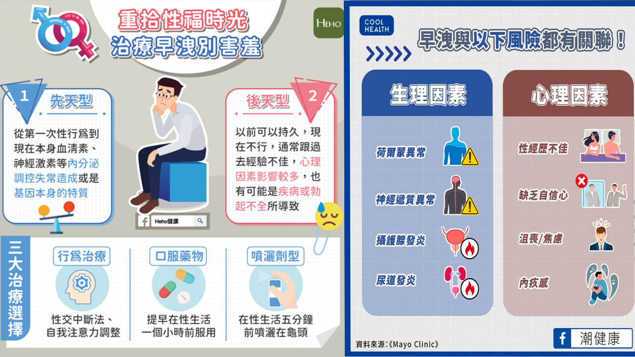 慢性攝護腺炎、高血壓、糖尿病、高血脂或男性荷爾蒙不足等,皆可能影響性功能並誘發早洩。