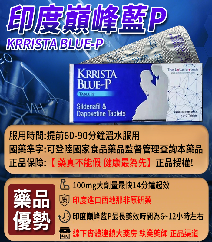 印度巔峰藍P KRRISTA BLUE-P 雙效片結合110mg西地那非+110mg達泊西汀的雙效配方,有效改善勃起功能障礙與早洩問題,一次解決「不夠硬」與「太快射」兩大困擾。由印度老牌藥廠 Ether Pharma 出品,藥效強勁、品質穩定,是重度性功能障礙男性的高效處方選擇。